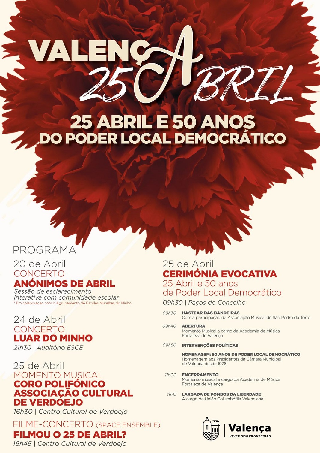 Valença assinala, no próximo dia 25 de abril, o 52.º aniversário da Revolução dos Cravos com um conjunto de iniciativas, que dinamizadas pelo Município, celebram a liberdade, a democracia e a participação cívica, convidando toda a população a associar-se às comemorações.